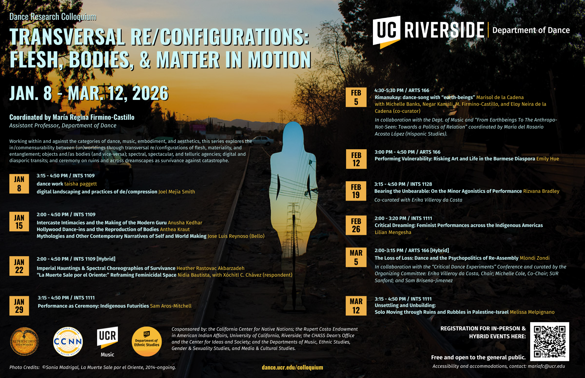 Transversal Re/Configurations: Flesh, Bodies, and Matter in Motion was made possible through generous sponsorships from the California Center for Native Nations; the Rupert Costo Endowment in American Indian Affairs, University of California, Riverside; the CHASS Dean’s Office and the Center for Ideas and Society; and the Departments of Music, Ethnic Studies, Gender & Sexuality Studies, and Media & Cultural Studies.