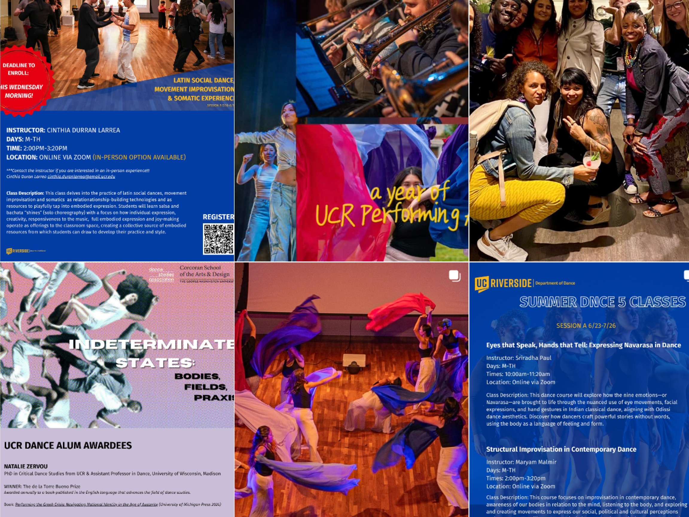 Festival of Social Dance is a multi-day event that includes dance workshops, lectures, and roundtable discussions. The workshops represent a range of social dance practices and diversify the kind of dances that fall under the umbrella of social dance. Centering BIPOC teachers, artists and scholars, and genres of dance not otherwise available on campus, the Festival is an excellent opportunity for Dance to extend and expand our curricular, artistic, and cultural offerings.